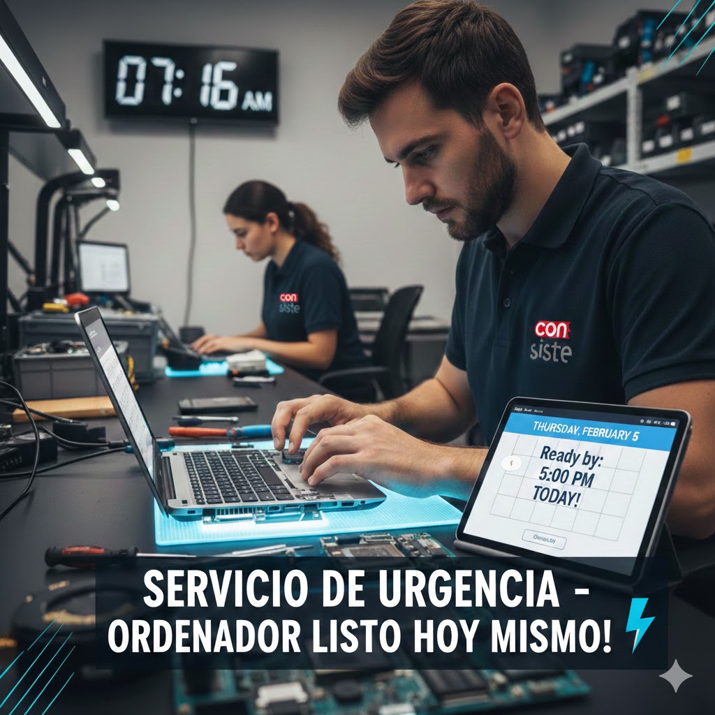 Si eres (o estás) de Boadilla del Monte y tu trabajo depende de tu ordenador, no puedes permitirte estar un día entero sin él, en Consiste Informática disponemos de un servicio de reparación urgente a tu medida para que vuelvas a trabajar cuanto antes. Priorizamos tu equipo desde el momento en que entra en nuestro taller o acudimos a tu domicilio y, siempre que la avería lo permita, lo dejamos reparado en el mismo día. Este servicio está disponible desde 100 € + IVA, con diagnóstico rápido, presupuesto claro y garantía en la reparación. Porque cuando tu ordenador es tu herramienta de trabajo, cada hora cuenta.